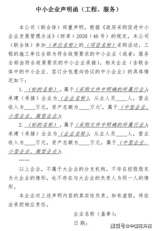 中小企业应当按照《办法》规定和《中小企业划型标准规定》(工信部联企业〔2011〕300号),如实填写并提交《中小企业声明函》,任何单位和个人不得要求中小企业供应商提交《中小企业声明函》之外的证明文件,或事先获得认定及进入名录库等。